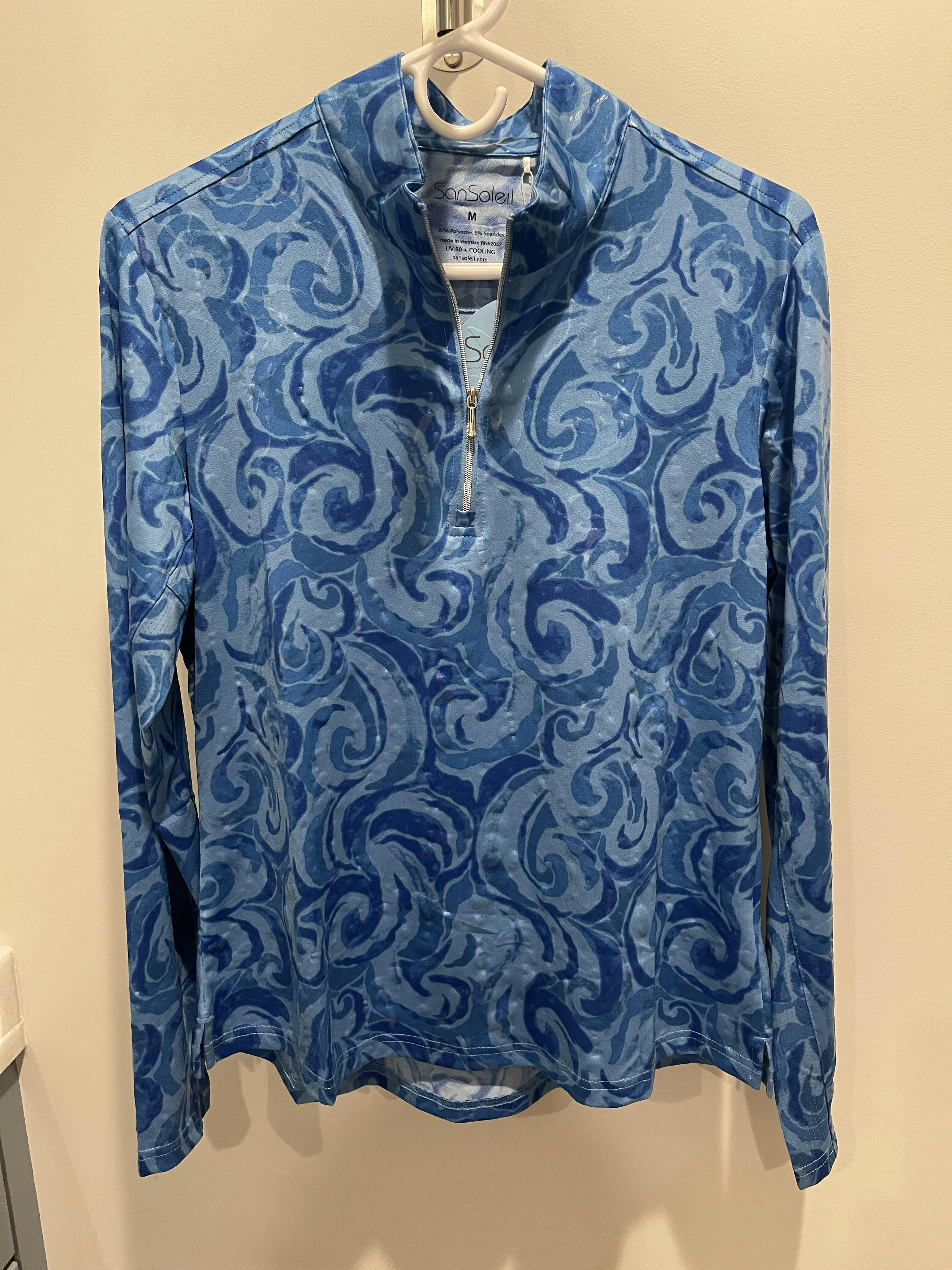 SANSOLEIL FOIL PRINT 1/4 ZIP MOCK. WHIRLWIND. BLUE. 900320