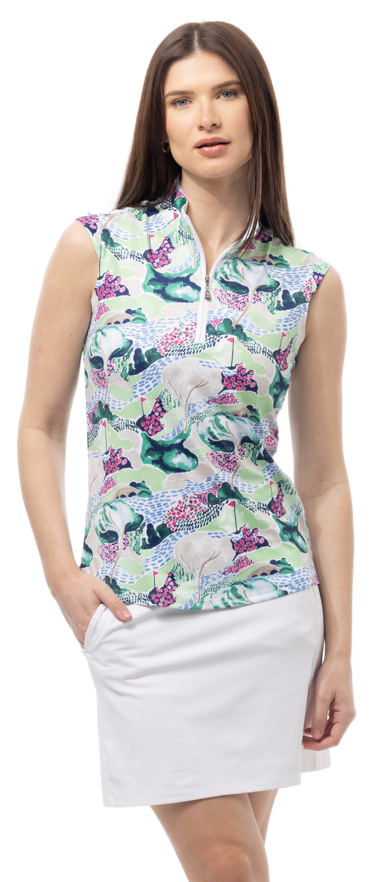 This SolCool Sleeveless Print Mock features a Crystal Diamond-Shaped Zipper Puller, UPF 50+ Sun Protection, plus extra COOLING. SanSoleil's SolCool Ultra Lightweight fabric reduces skin temperature by 3-5%.