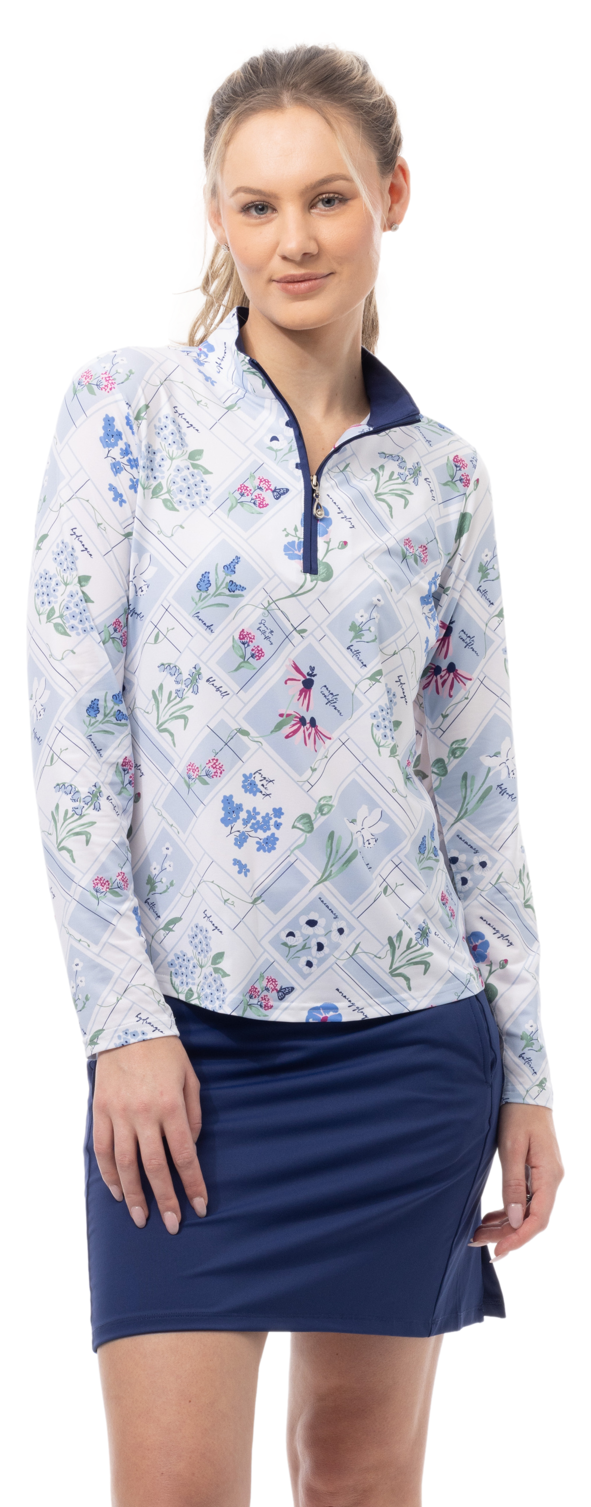 SanSoleil's SolCool long-sleeve 1/4-zip mock with crystal Zipper Puller is the Perfect Top to protect you from the sun and keep you cool in style.