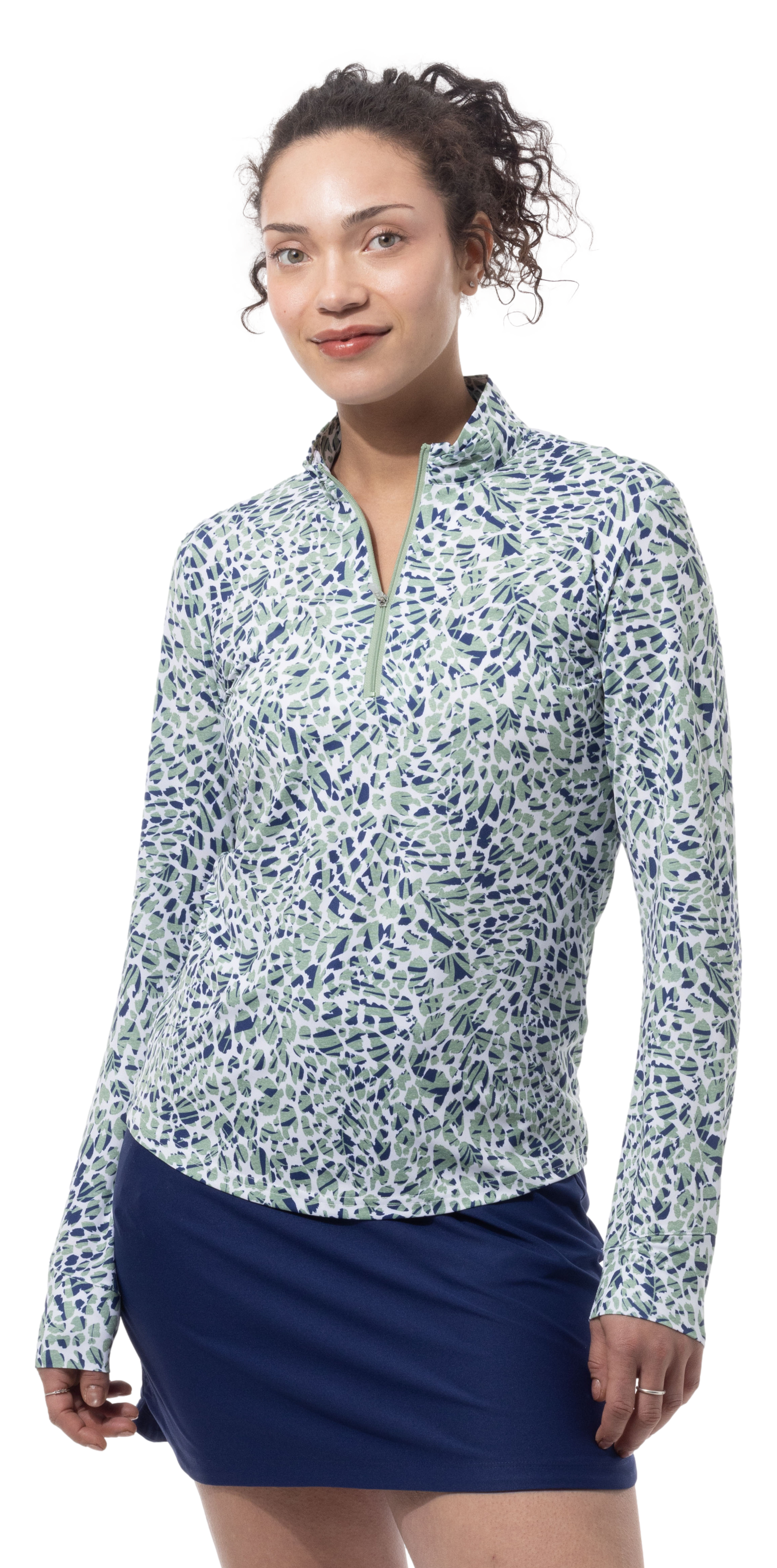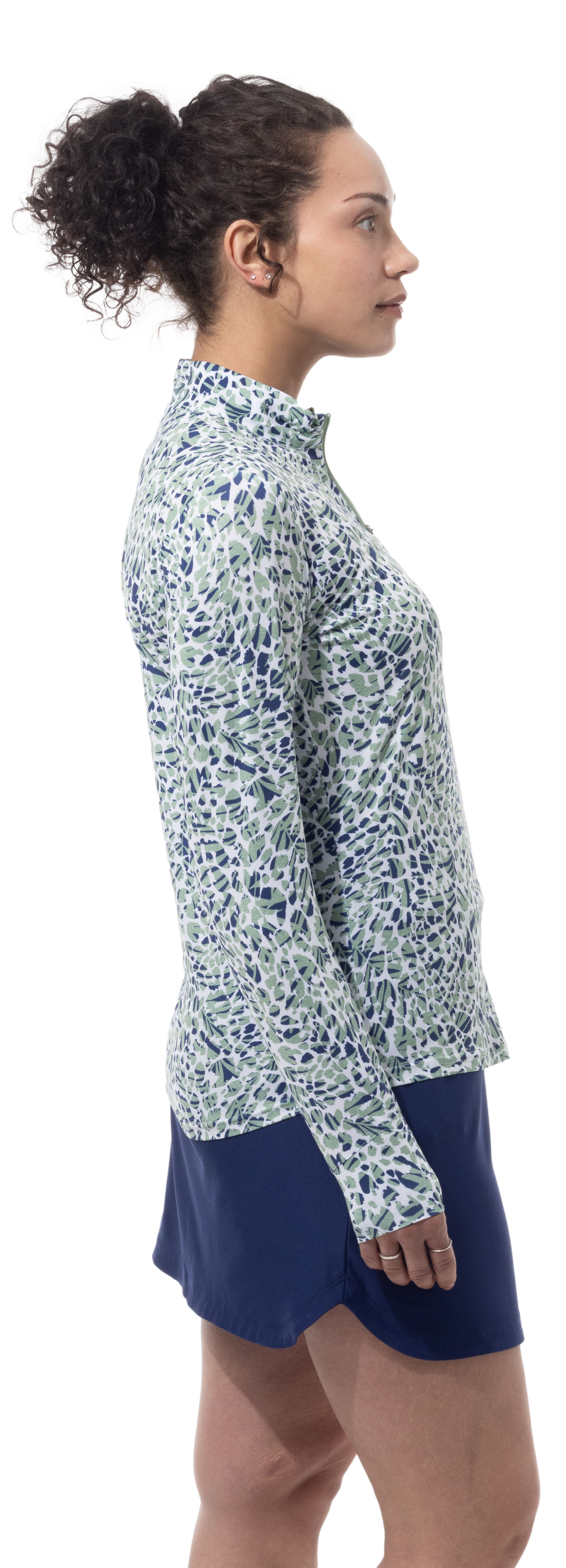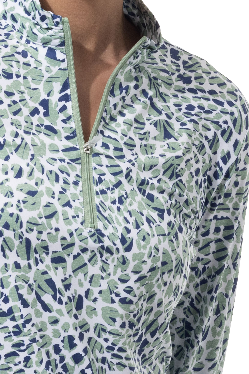 SANSOLEIL SOLMELANGE 1/4 ZIP PRINT MOCK. JUNGLE CAT. MOSS. 900453P